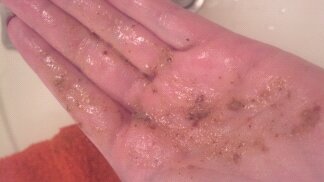 The first impression of this scrub is a little odd, it comes in a glass jar with a twist off lid. Upon opening it I looked at it and said "what the heck" because the look and texture is really unlike any other scrub I've encountered (but I usully buy the cheap stuff). It's really dry and has almost a chalky texture in the jar but on the box it says just to add a few drops of water to a "small amount" and then work it into a paste.